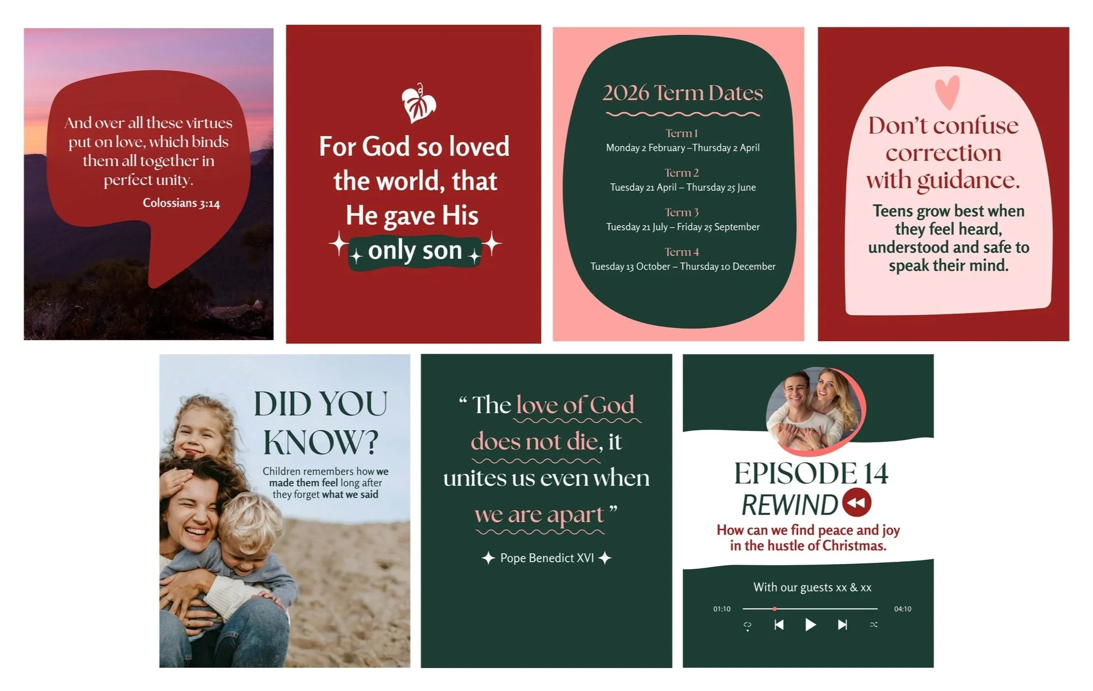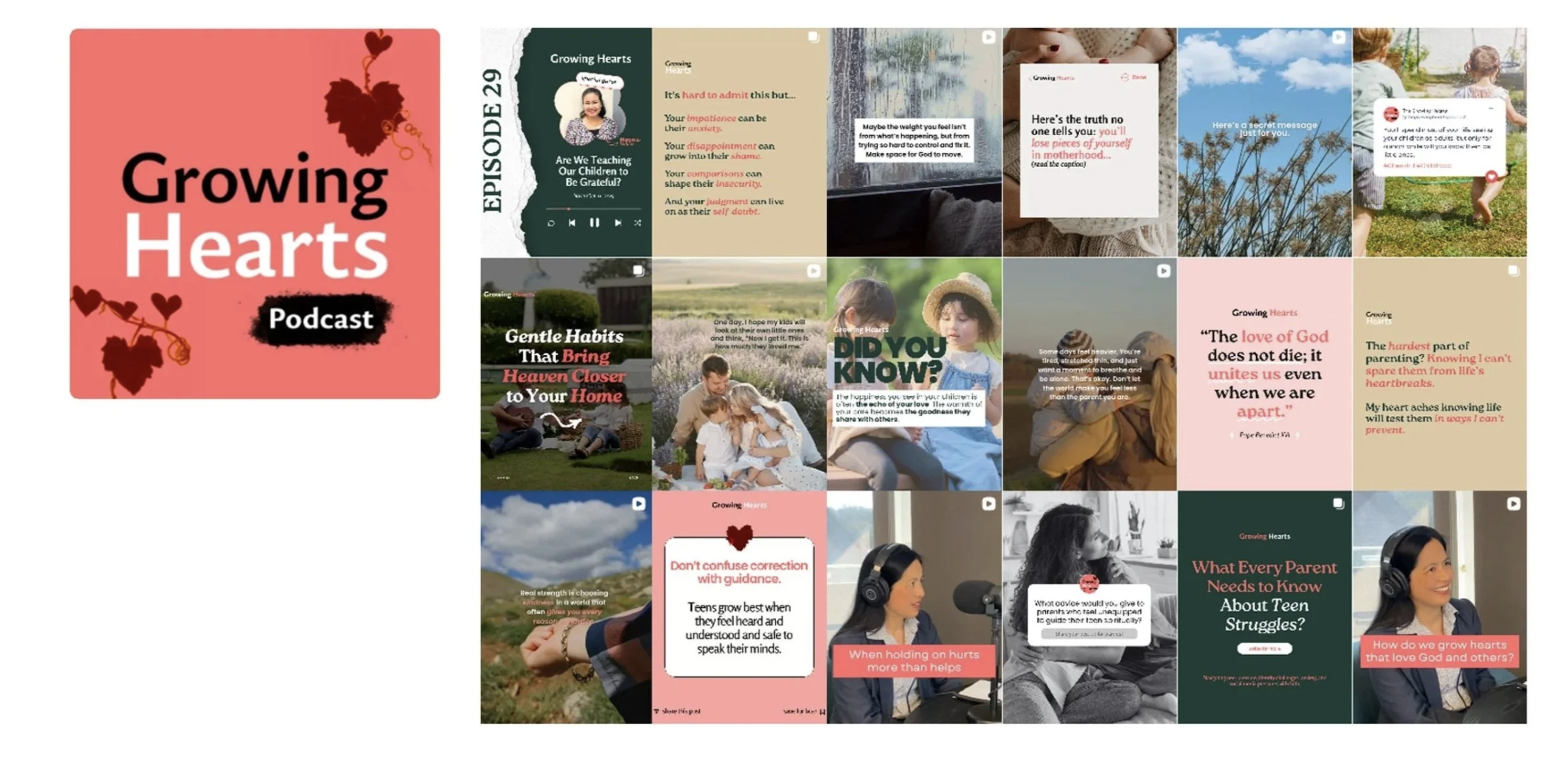 The Challenge: Revitalise the Growing Hearts Podcast brand to better align with its target audience (women aged 30+, predominantly mothers), informed by market research. Exercise restraint to ensure the brand does not stray too far from its original voice. Develop Canva templates to support consistent, cohesive social media tiles.