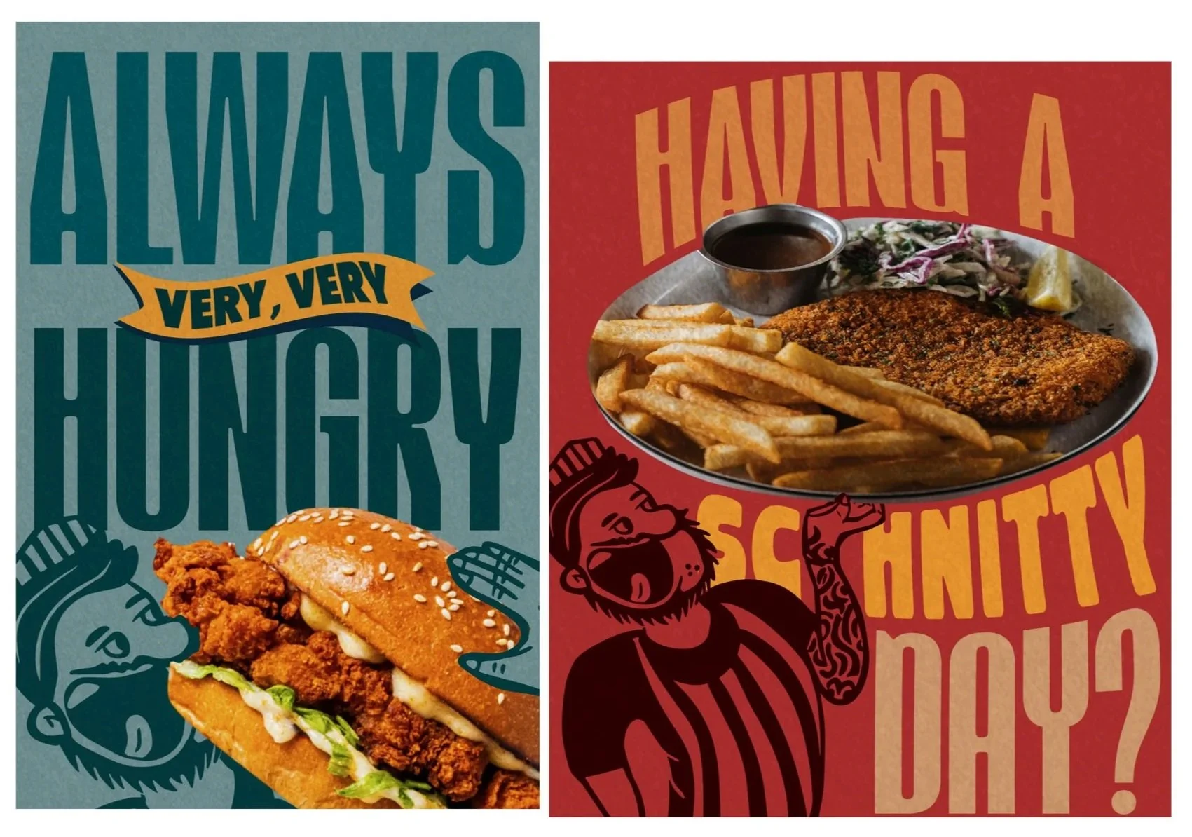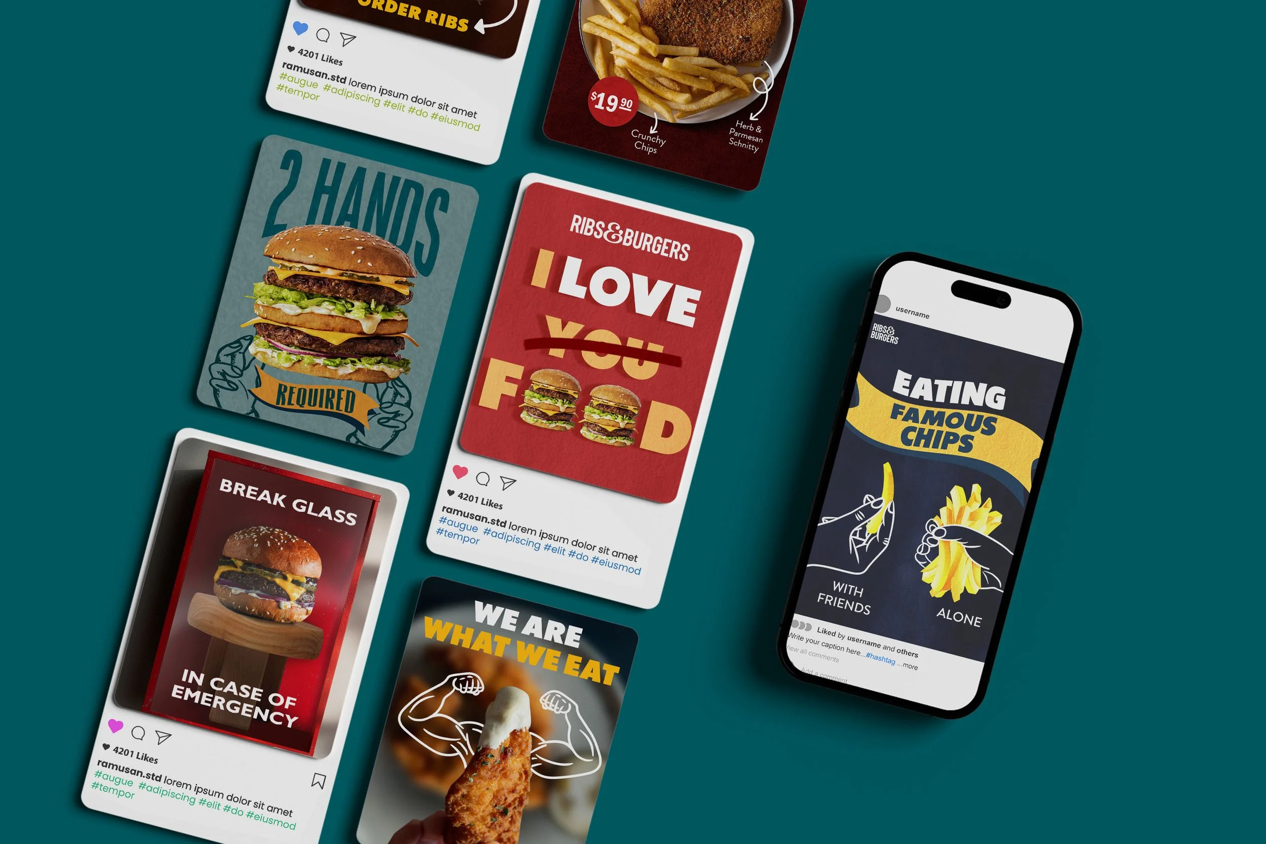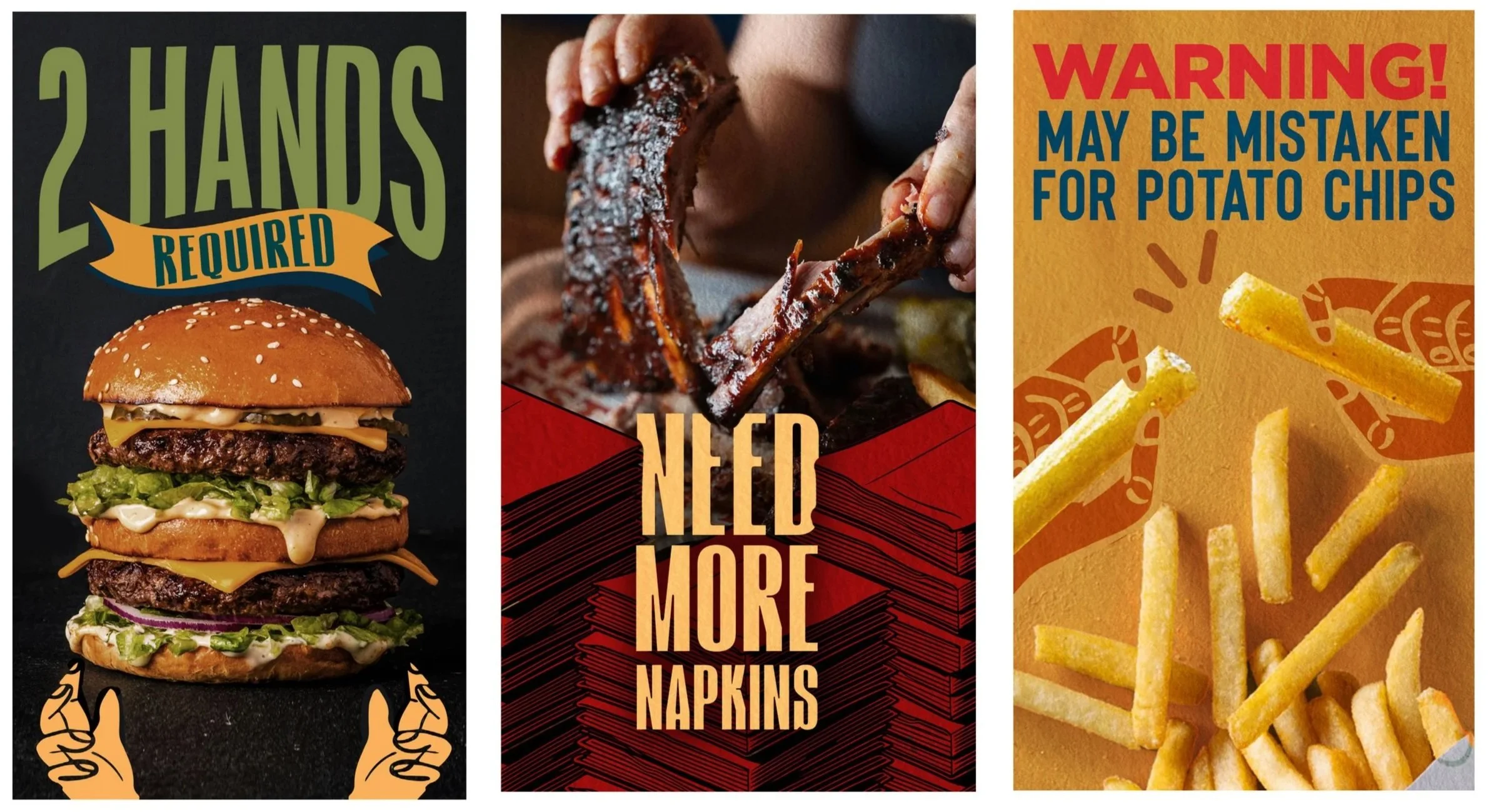 Solution: We threw out the industry playbook. Bold typography fills frames edge to edge, sometimes breaking right out of them. Single-colour illustrations are layered over hero food photography to exaggerate portion sizes to near-ridiculous effect, making the value proposition visible before anyone reads a word. The copy pulls its weight too: lines like "2 Hands Required" and "Need More Napkins" are short, witty, and let the audience do the thinking. The tone is warm, a little chaotic, and completely on-brand. The result is a social feed that feels nothing like the competition and exactly like the food: bold, generous, and a bit of a good time.