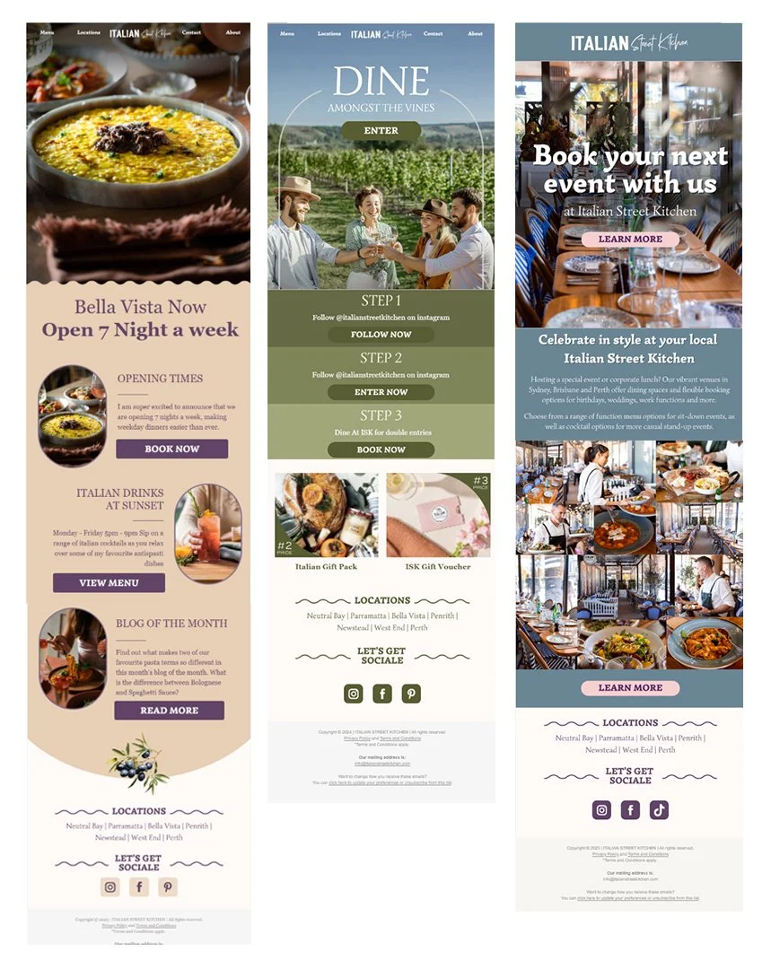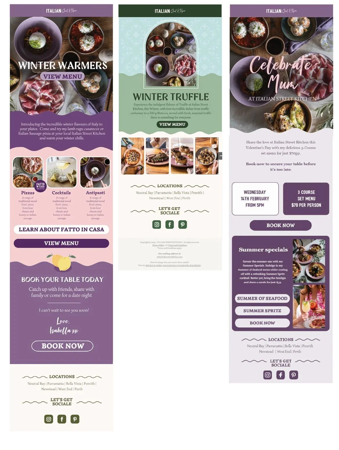 The Challenge: the templates for Italian Street Kitchen EDM were outdated. Design new templates based on the new branding that are eye catching and bold while still remaining easy to follow and read. These templates are to be designed in Canva which allows for easy replacements of copy, colours and images for different campaigns.