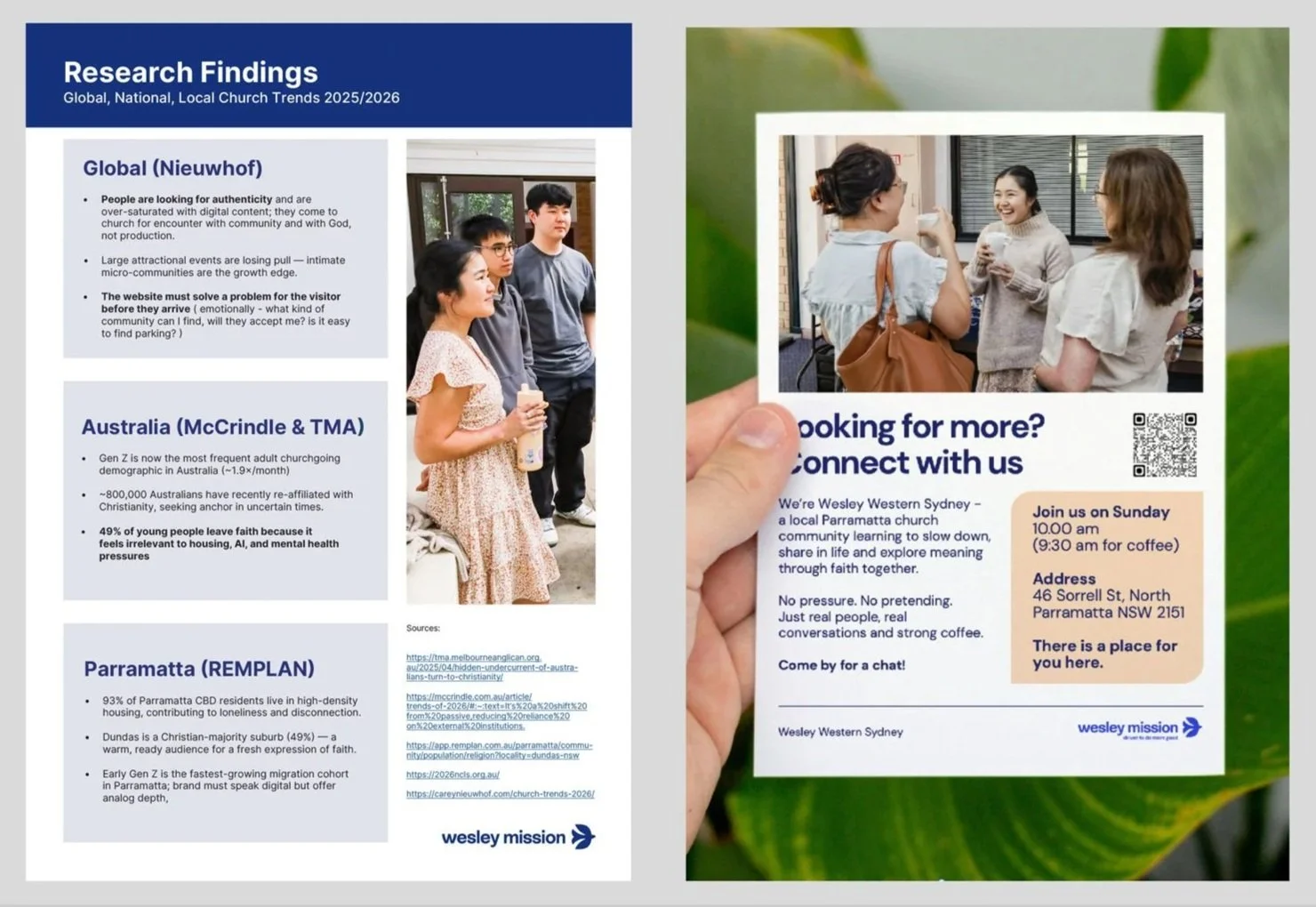 Goal: Position Wesley Western Sydney as a third place: a community you belong to, not a service you attend. Research-led, resource-light, and speaking authentically to a culturally diverse, digitally native audience.