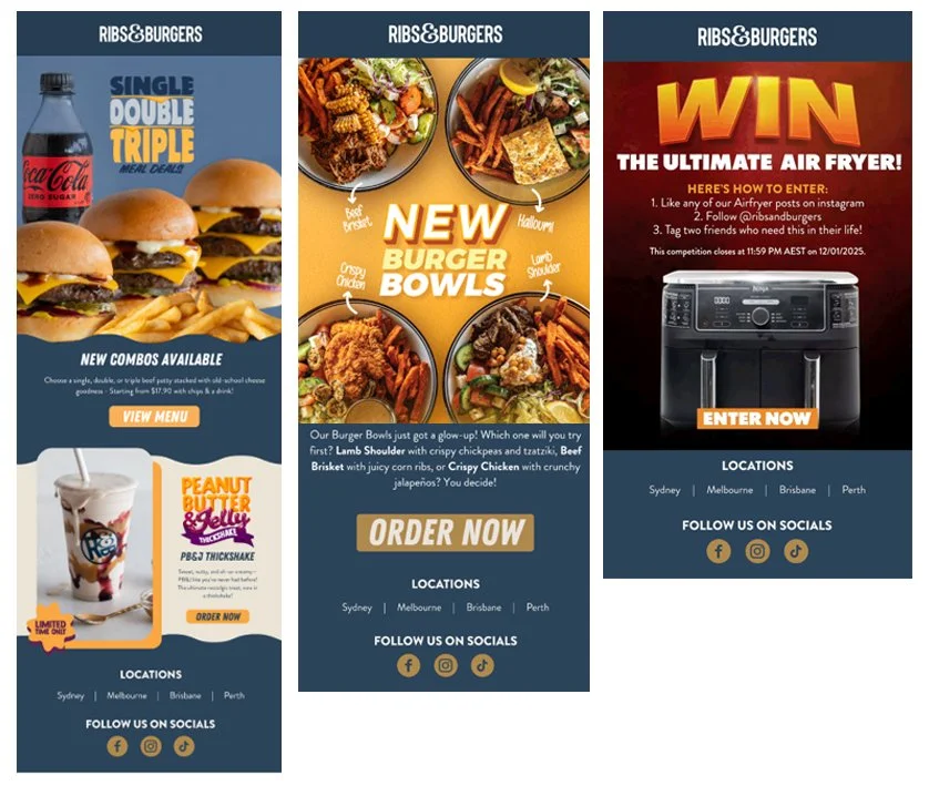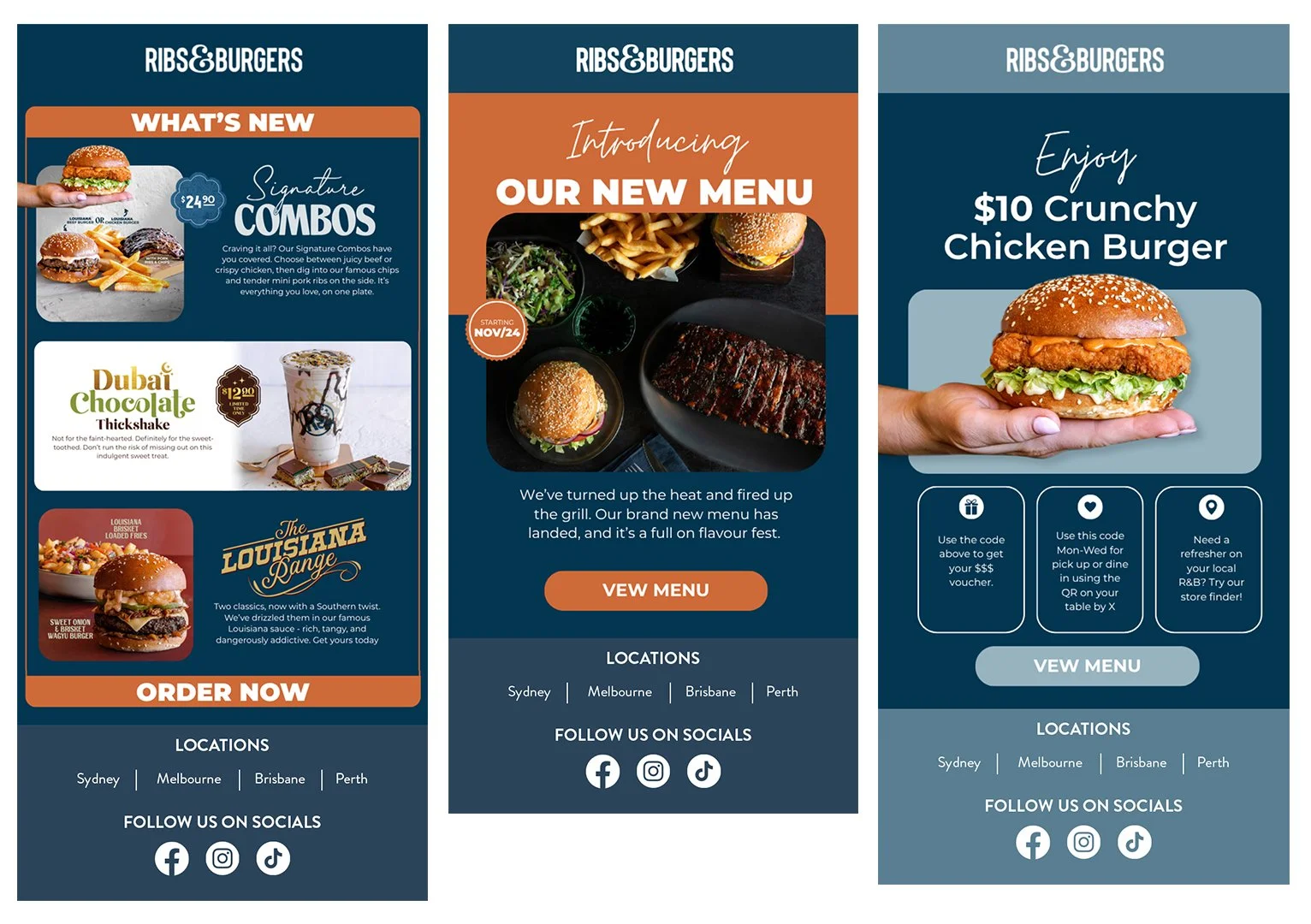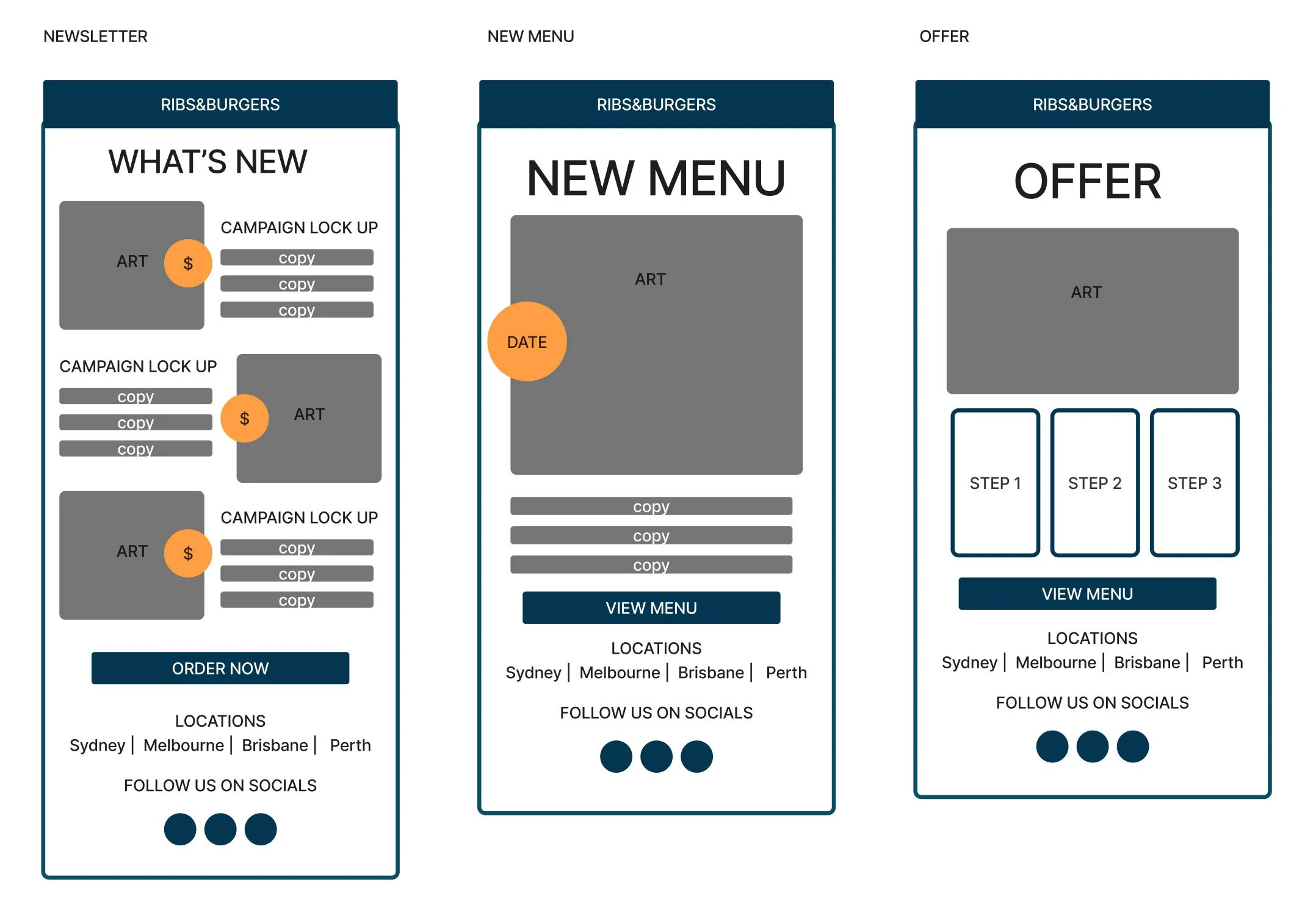 The Challenge: the templates for Ribs & Burgers EDM are outdated and did not look cohesive. Design new templates for a newsletter, new menu and offer templates that are eye catching, bold while remaining clean and accessible. These templates are to be designed in Canva which allows for easy replacements of copy, colours and images for different campaigns.